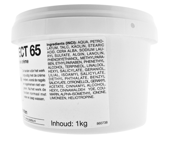 Waterbestendige creme tegen zuren en alkaliën en in wateropgeloste stoffen, zoals waterdragende verven, lakken en inkten. Dermotect is een specifieke huidcreme. voor gebruik in garagebedrijf, chemische industrie, in de bouw; en in de voedingsindustrie. De huidcremes in deze categorie beschermen tegen uiteenlopende schadelijke stoffen. De cremes doen hun werk ook nog na contact met water. Er wordt hiermee een onzichtbare handschoen verkregen die na het werk eenvoudig met onze handreinigers is te verwijderen. Dermotect 65 geeft bescherming tegen chemische stoffen.